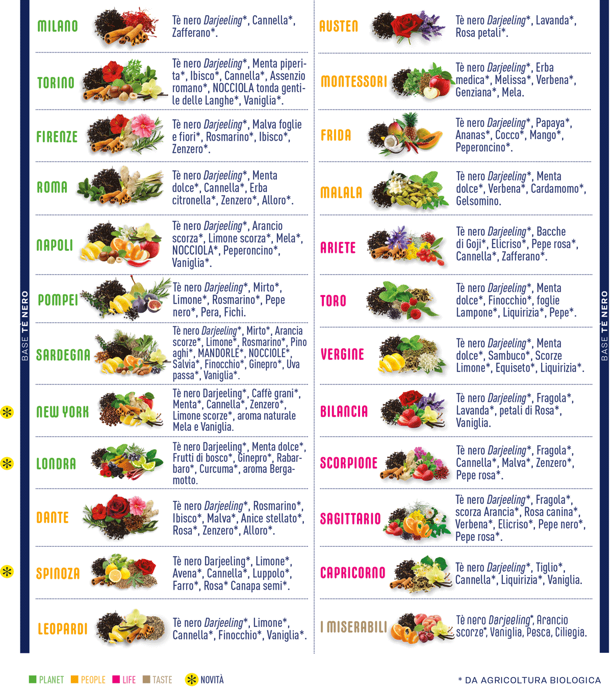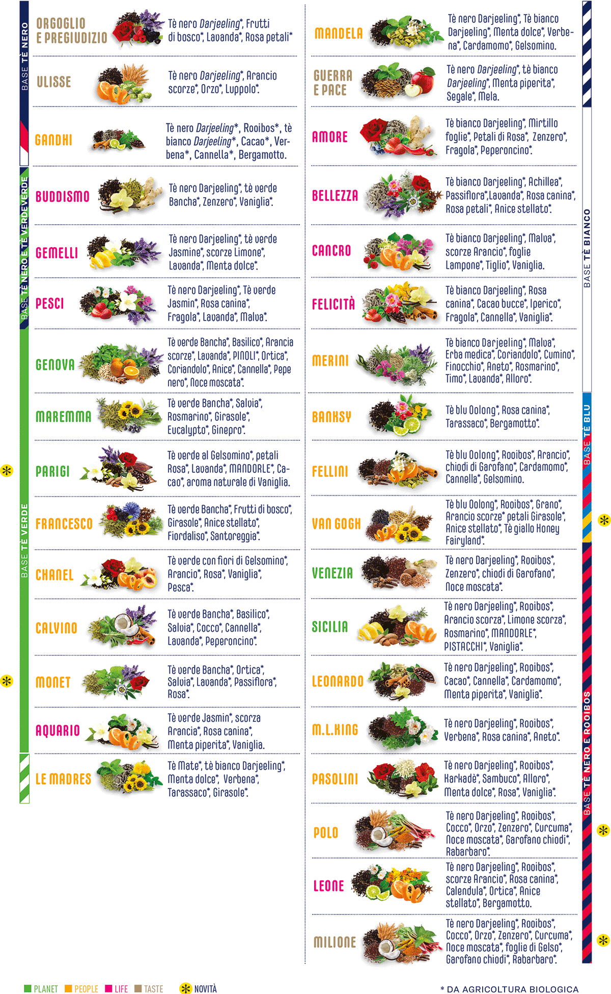 Pregiati tè biologici, artigianali, formulati e confezionati singolarmente a mano in Italia. La confezione monodose preserva la fragranza degli aromi e garantisce la massima resa nell’infusione. Sani e buonissimi. Ogni singolo blend è inedito, formulato ad hoc per il titolo collegato con l’intento che il racconto prosegua attraverso il sapore.