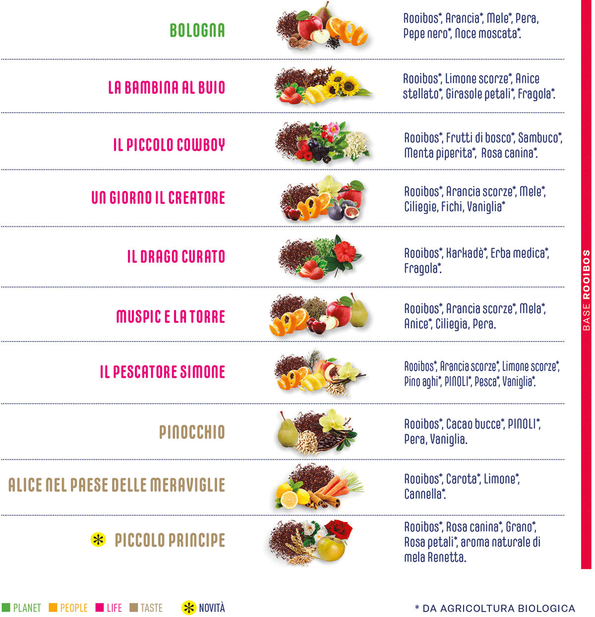 Il Rooibos è composto da foglie essiccate di Aspalathus linearis, una pianta arbustiva sudafricana. Nella lingua locale (afrikaans), rooibos significa “cespuglio rosso”. Nei Paesi occidentali il rooibos è impropriamente chiamato “tè rosso africano” ma, pur condividendo con il tè molti principi salutari, non contiene teina. Tutti i blend sono biologici, inediti e formulati ad hoc per ogni titolo, così che il racconto prosegua col sapore, ma soprattuto sono buonissimi.