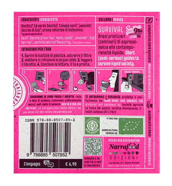 Oltre ai 10 paragrafetti del testo dedicato all’infusione, abbiamo dedicato 2 pagine con gli esercizi psicofisici di sopravvivenza a cura della dott.ssa Ilaria Caelli. Di Elena Molini (della Piccola Farmacia Letteraria di Firenze) invece i suggerimenti delle letture di sopravvivenza. L’ultima pagina del libretto ospita il qr-code necessario ad accedere ai relativi contenuti multimediali.