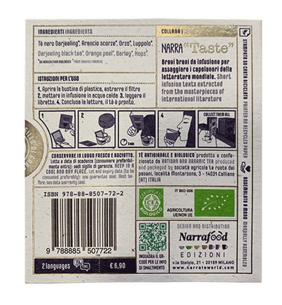 Oltre a una base di robusto, corposo e squisito tè nero Darjeeling, il blend ispirato all’Irlanda di inizio novecento contiene scorze d’Arancia che rimandano alla spremuta consumata a colazione come raccontato nel primo capitolo del romanzo. L’Orzo è una chiara evocazione del whisky così come il Luppolo della birra, diffusamente presenti nel territorio e nel romanzo ambientato a Dublino, contribuendo a restituire quel sapore un po’ torbido ma piacevole dell’atmosfera dell’Ulisse.