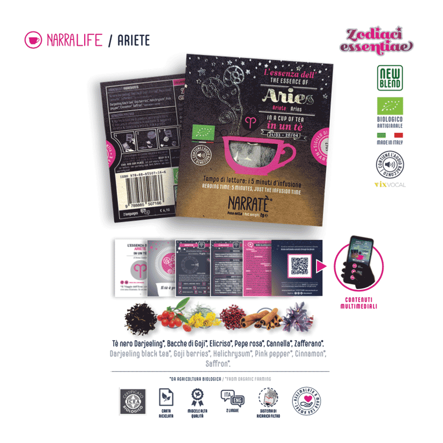 L’inedito blend dell’Ariete, dal sapore netto e deciso, è una raffinata miscela composta da: tè nero Darjeeling*, bacche di Goji*, Elicriso*, Pepe rosa*, Cannella* e Zafferano*. - * da agricoltura biologica.