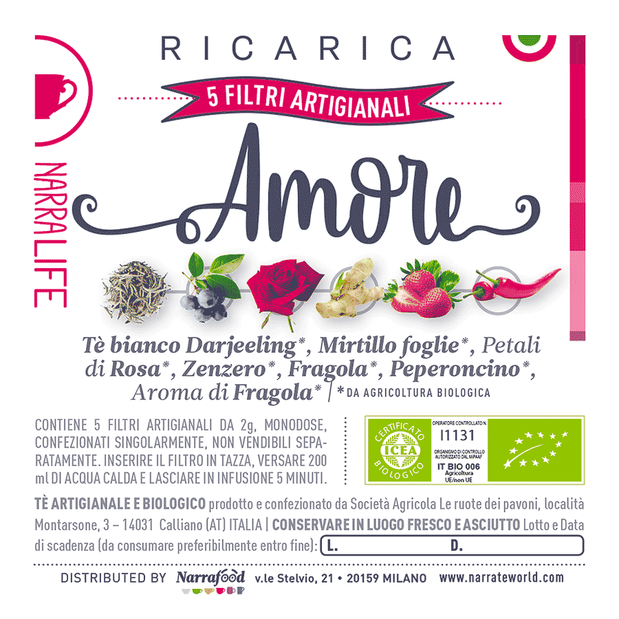 La confezione in cartoncino biodegradabile, contiene 5 filtri monodose del blend AMORE. Ogni filtro è ARTIGIANALE, BIOLOGICO e MADE IN ITALY, ciascuno con 2g di tè di alta qualità taglio tisana. Non è provvisto né di filo né di pendulino in carta per non aggiungere altri elementi potenzialmente inquinanti sia nell’infuso che nella filiera di produzione. La piccola azienda agricola piemontese con la quale formuliamo gli aromi per ogni titolo, li confeziona assieme ai tè, applica le più rigorose politiche di rispetto e tutela sia ambientali che lavorative. La certificazione biologica è invece affidata a ICEA.