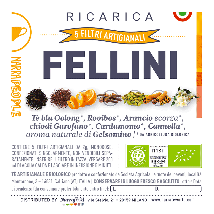 La confezione in cartoncino biodegradabile, contiene 5 filtri monodose del blend FELLINI. Ogni filtro è ARTIGIANALE, BIOLOGICO e MADE IN ITALY, ciascuno con 2g di tè di alta qualità taglio tisana. Non è provvisto né di filo né di pendulino in carta per non aggiungere altri elementi potenzialmente inquinanti sia nell’infuso che nella filiera di produzione. La piccola azienda agricola piemontese con la quale formuliamo gli aromi per ogni titolo, li confeziona assieme ai tè, applica le più rigorose politiche di rispetto e tutela sia ambientali che lavorative. La certificazione biologica è invece affidata a ICEA.